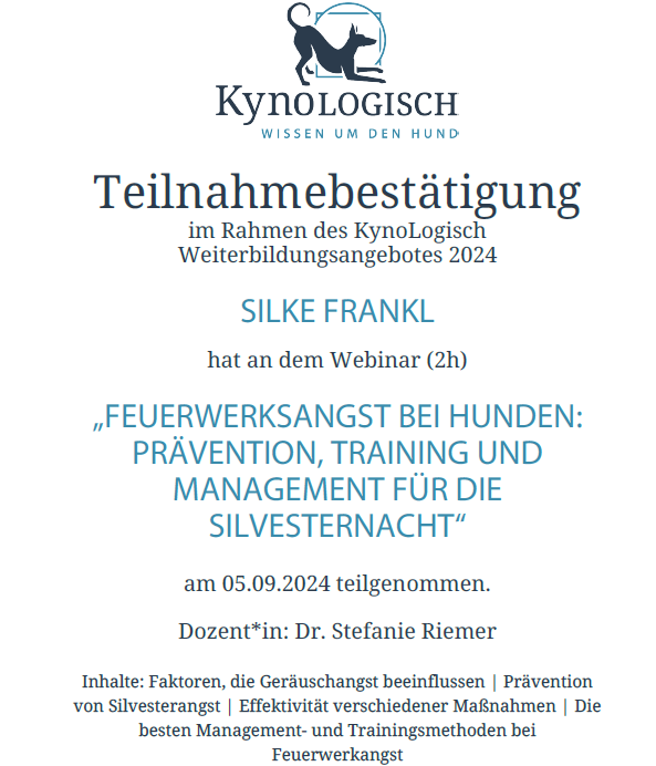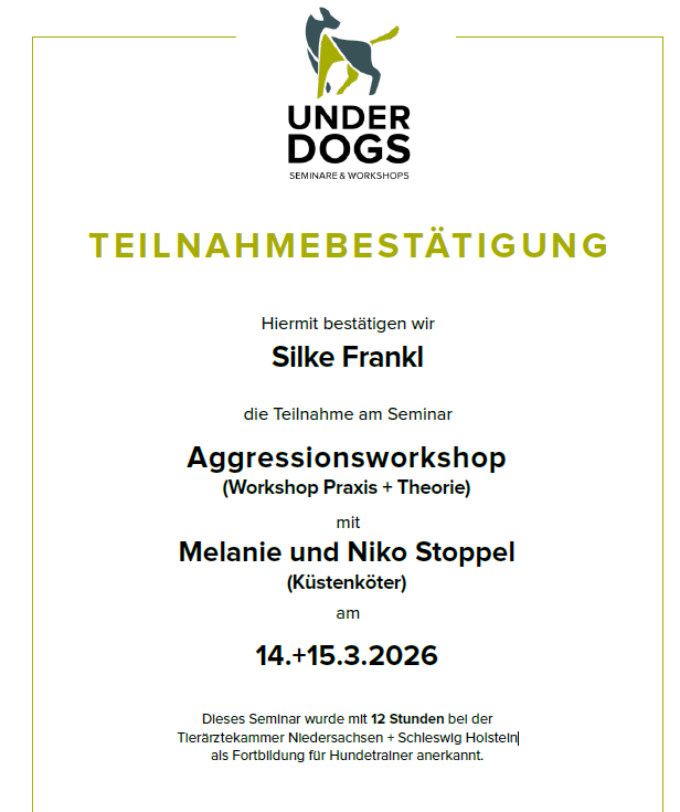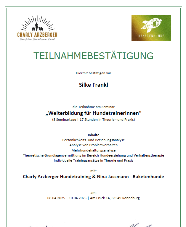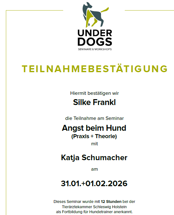 Um meine Kompetenzen gezielt auszubauen, habe ich kürzlich die Ausbildung zur Hundetrainerin erfolgreich abgeschlossen. Dadurch bin ich noch besser darauf vorbereitet, individuell auf unterschiedliche Verhaltensweisen und Bedürfnisse von Hunden einzugehen und nachhaltige Lösungen im Training zu erarbeiten.